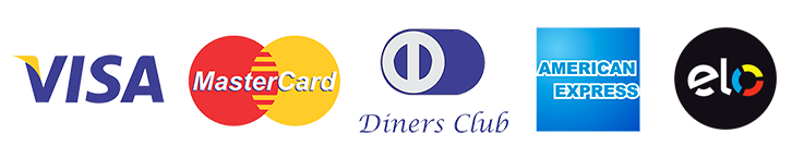 São aceitas as principais bandeiras: Visa, Mastercard, American Express, Elo, Hipercard, Aura, JCB, Diners e Discover.