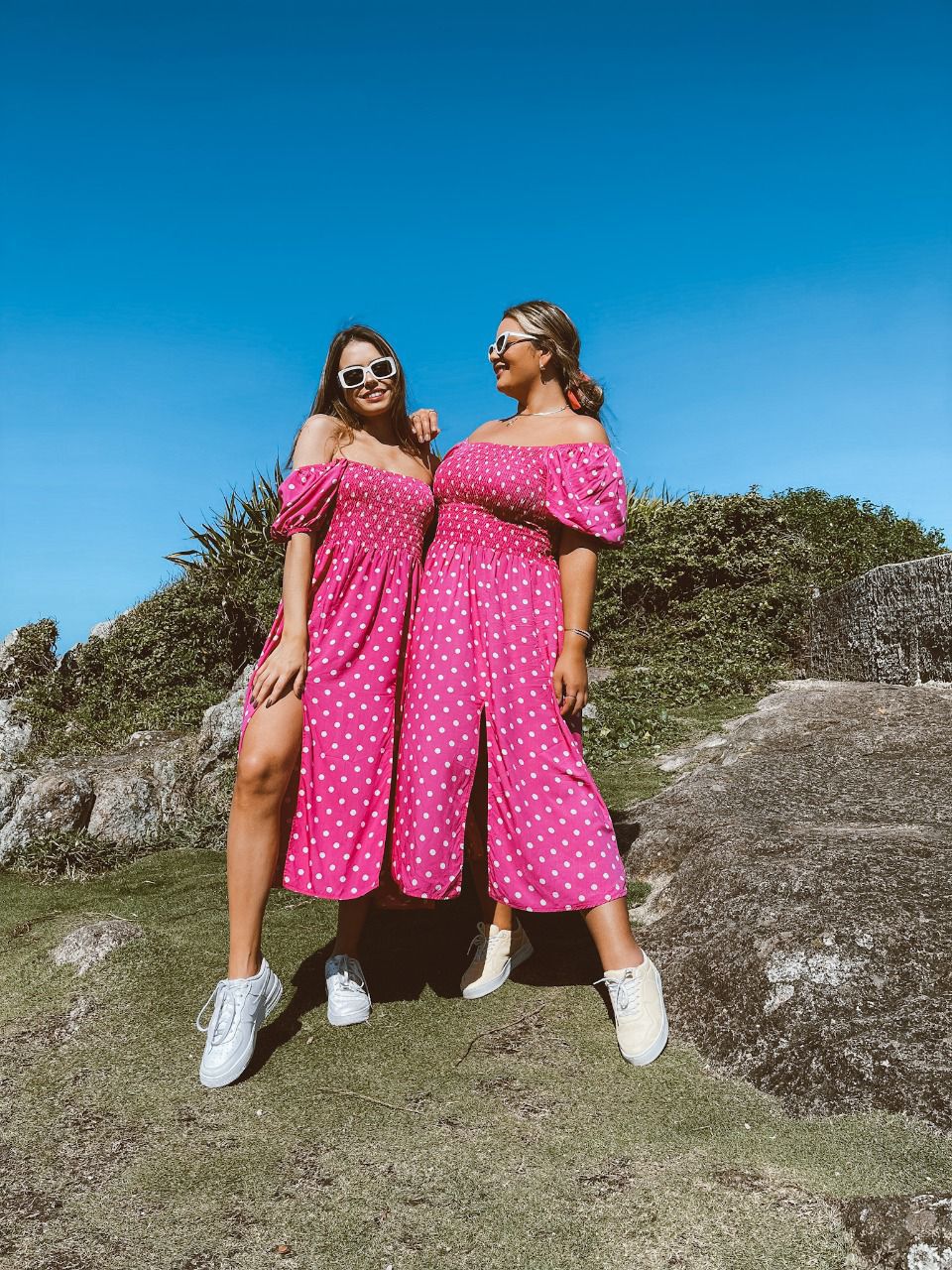 Vestido com lastex no busto, manga bufante (pode ser usada no ombro e como ciganinha), comprimento midi e duas fendas na frente.